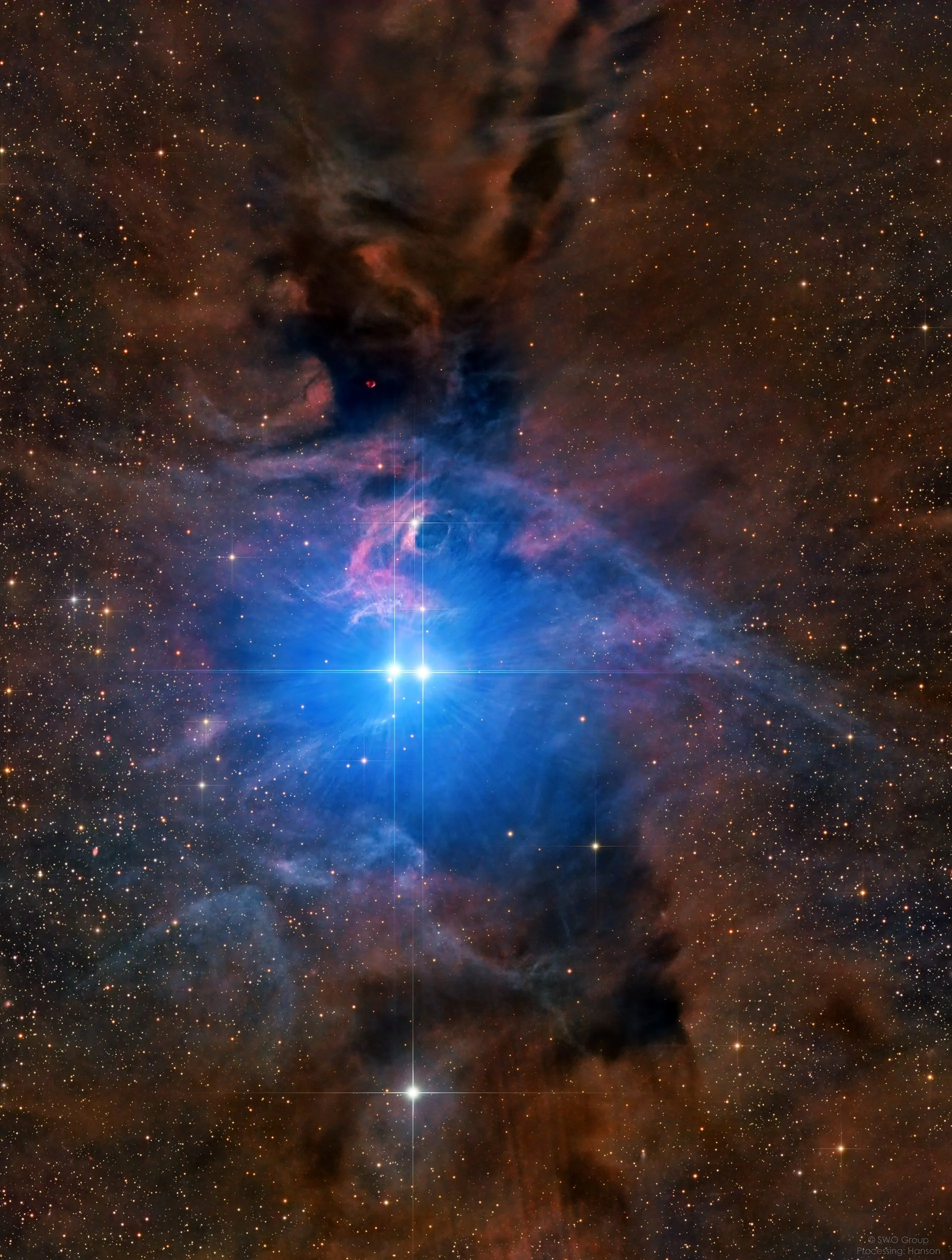 This interesting area in the Lupus 3 molecular cloud, at the border of the Scorpius and Lupus constellations about 500 light years away, contains Bernes 149, a blue reflection nebula. Infrared observations revealed numerous protostars, young stars, and Herbig-Haro objects; HH78 is seen as a red spot above the image center, in a dark cloud.