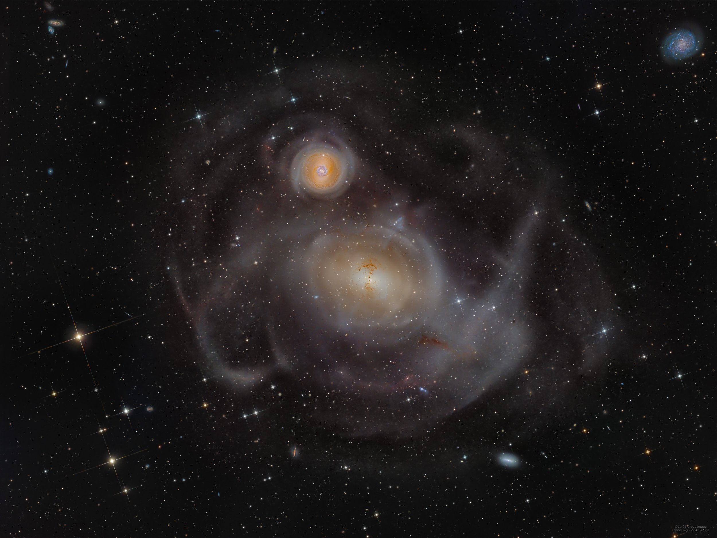 Ripples, Loops, and Arcs: Faint, extensive shells and ripples comprising stars and gas are observable in the galaxy’s outer regions, indicating tidal disruptions characteristic of previous merger events.