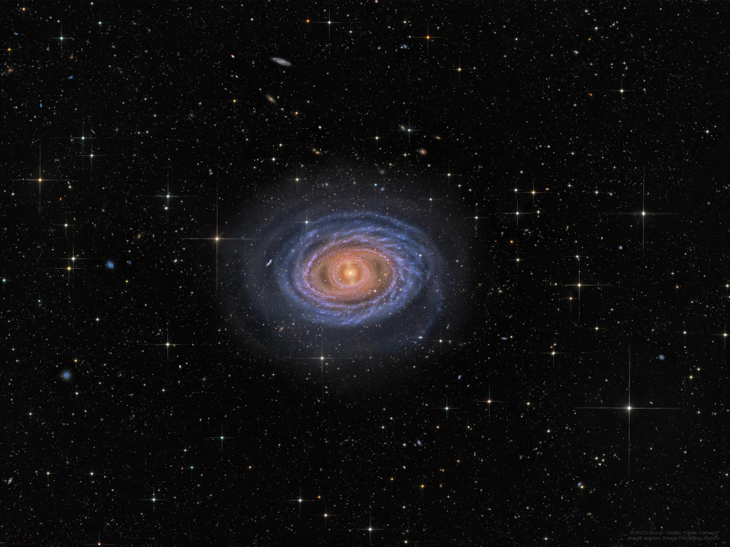 This stunning photograph showcases the face on spiral galaxy NGC 1398, located approximately 65 million light-years from Earth in the constellation Fornax. NGC 1398 is classified as a barred spiral galaxy; in this image, its brilliant central bar and graceful spiral arms stand out vividly and eventually those spiral arms fade amid a sea of stars. However, a closer look reveals the surrounding space is filled with subtle glimmers and swirling shapes of countless distant galaxies. Larger than our own Milky Way, NGC 1398 boasts more than 100 billion stars.