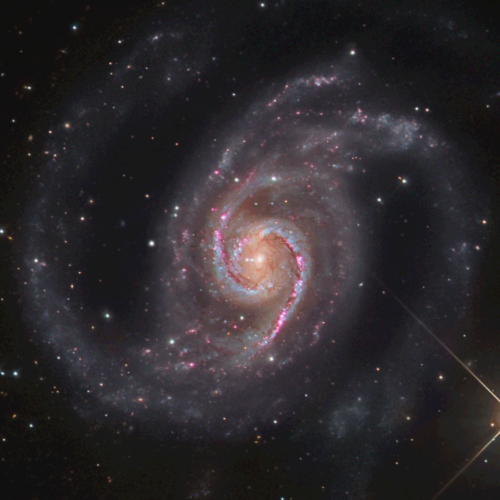 NGC 1566, sometimes called the “Spanish Dancer” is located in the constellation Dorado, and is the brightest and most dominant galaxy in the Dorado Group, which is one of the richest galaxy groups in the southern hemisphere.