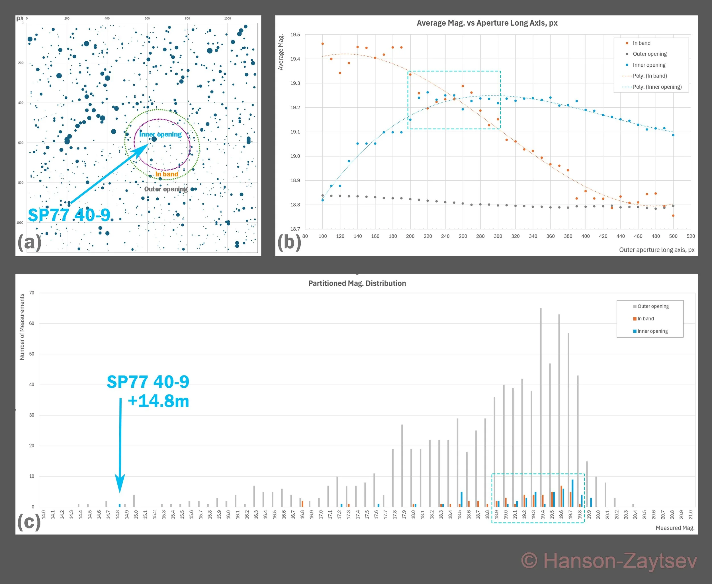 Tile (a) shows the plot reconstructing the cropped version of the L channel integral image from photometric data extracted from it using the Aperture Photometry Tool [17]. The SP77 40-9 [12] +14.8m star is used for absolute calibration of star magnitude measurements. The image frame is split into 3 parts with two concentric and coaxial elliptical boundaries: the “inner opening”, the “outer opening”, and the “in band” area in between.