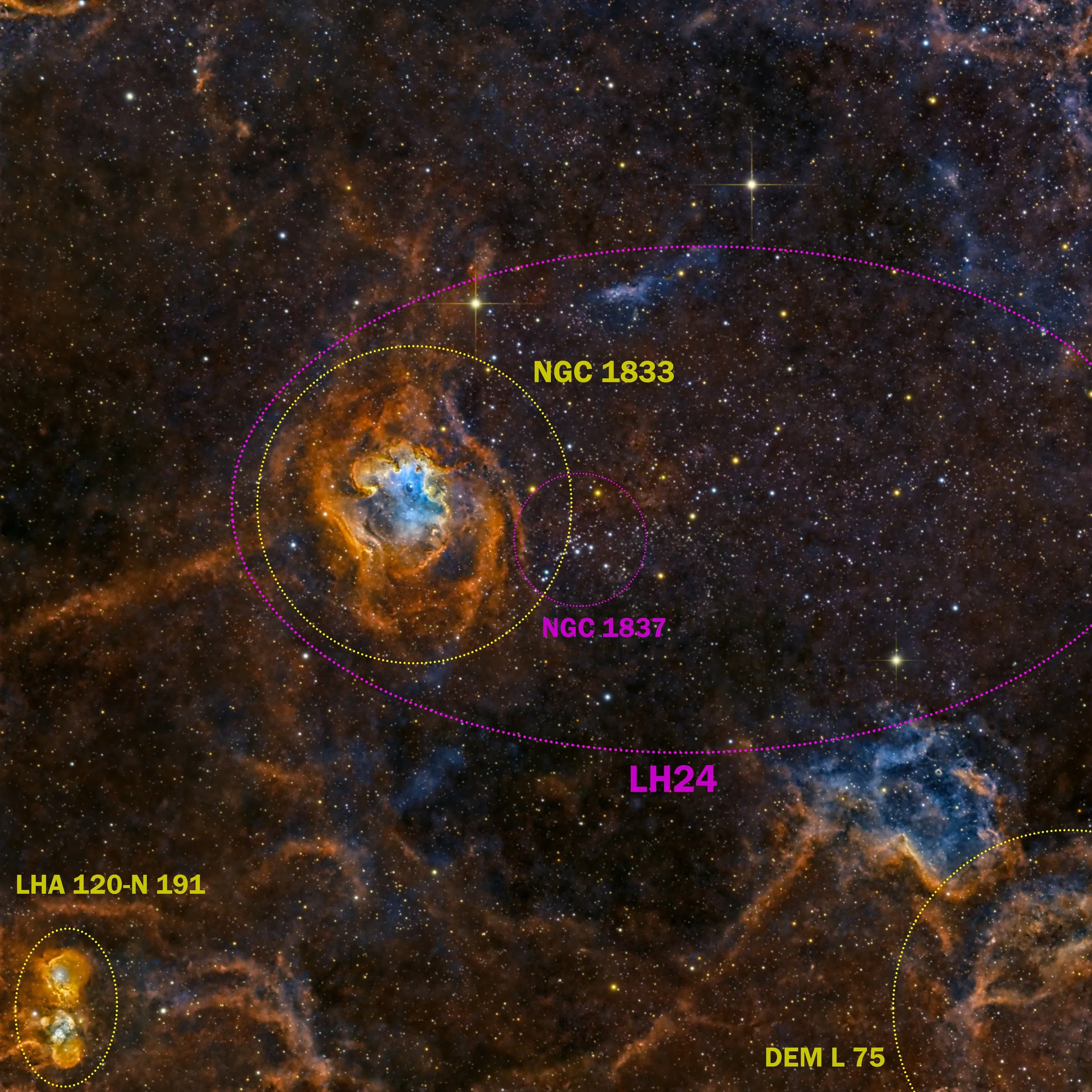 Here is a closer look at the part of the LMC 8 supergiant shell [1-4] located South-West of the Large Magellanic Cloud (LMC) containing the LH24 OB star association [5] with NGC 1833 emission nebula [6] and NGC 1837 open cluster [7] enclosed within obtained with the Chilescope T1 system (ASA Ritchey-Chretien RC-1000: D=1m, f/6.8). The Manually annotated version of the image is shown in Fig. 1. A wider angle view of this region near the LMC was also obtained earlier using the Chilescope T3 system (ASA-N D=0.5m, f/3.8) [8], yet significantly more details of internal structure are revealed here for the three main diffuse structures: