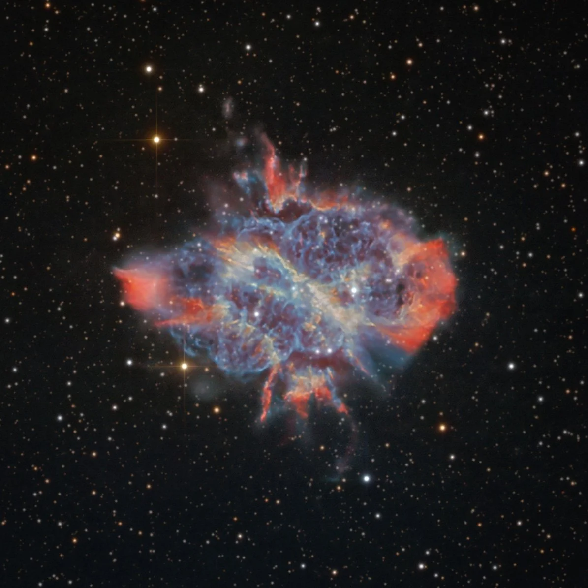 NGC 5189 is among the most intricately structured planetary nebulae visible in our night sky. Its vibrant display of colors—yellow for sulfur, red for hydrogen, and blue oxygen—maps out the last emissions of a star as it sheds its outer layers. These elements enrich the nearby interstellar space, providing material that may form new stars and planets in the future.