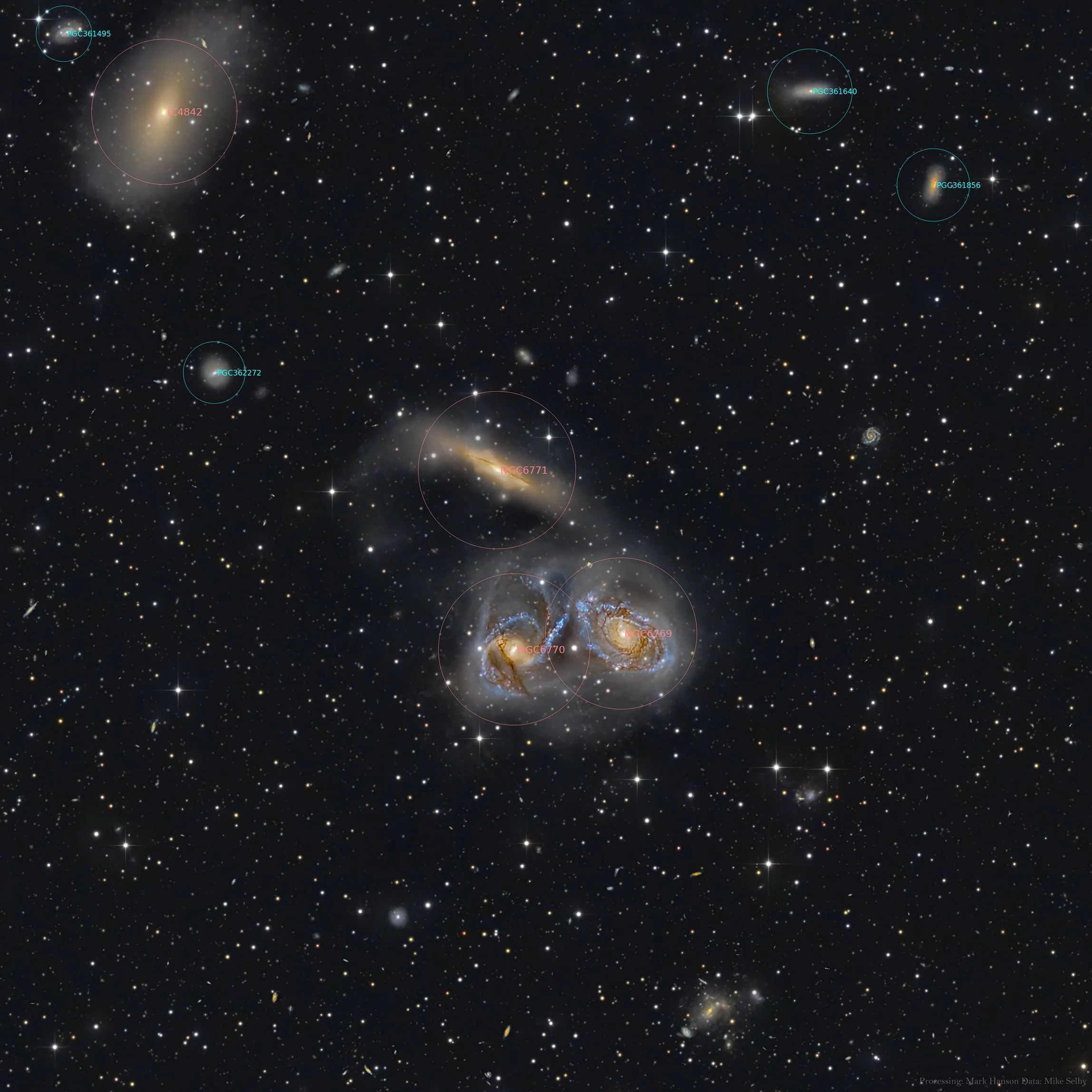 As dramatic and destructive as this may seem, such an interaction event is also an enrichment, a true baby-star boom. A cosmic catastrophe like this one normally results in the formation of many new stars. This is obvious from the blueish nature of the spiral arms in NGC 6769 (lower right) and NGC 6770 (lower left) and the presence of many sites of star forming regions.